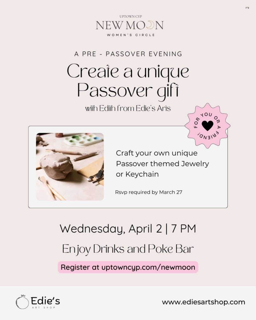 Create a unique Passover gift for you or a friend. Learn the art of clay sculpting with Edith from Edie’s Arts. Craft your own unique Pesach-themed Jewelry or keychain!